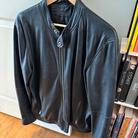 Bemærkninger: Der er en revne i hjørnet af den højre lomme. Størrelse- og sammensætningsmærkatet mangler. Farve: Sort---Materiale: Læder---Produktmål: Skulder: 44; Ærme: 65; Bryst: 50; Længde: 70
