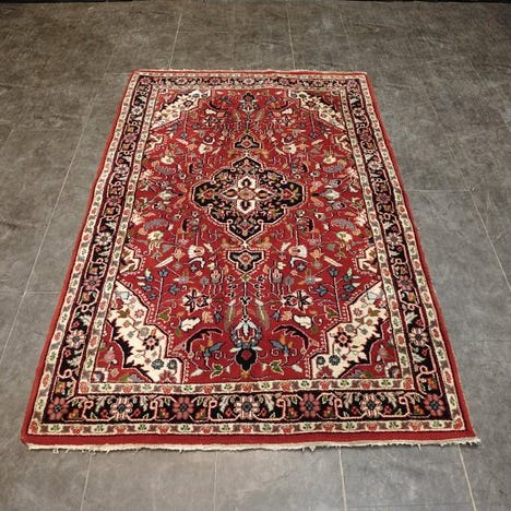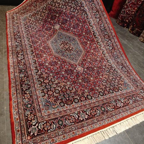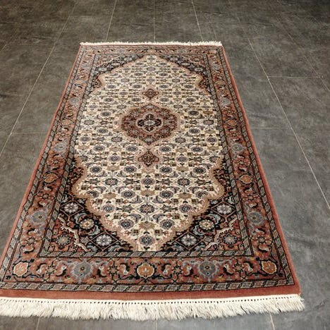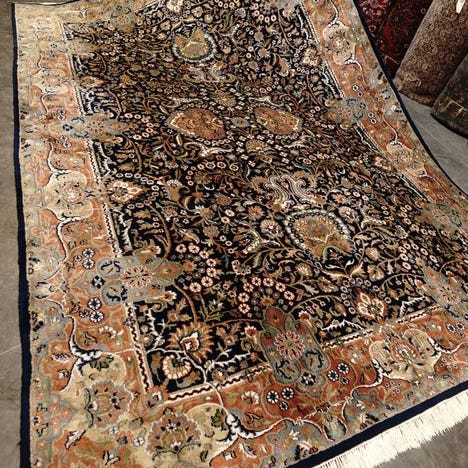 Oprindelse: Indien; håndknyttet Tabriz-inspireret tæppe i uld på bomuld, 300 x 197 cm, i godt samlet stand med alders- og brugsspor. Klik på den blå "gå til varen" knap, for at købe eller byde på denne vare. Den samlede pris vil blive vist inden du afgiver dit bud.