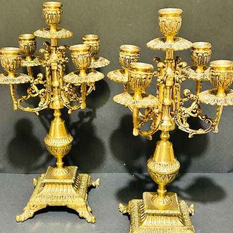 Kandelabrerne vejer 5,2 kilo pr. stk. Disse kandelabre er fra omkring 1880. 140 år gamle og i god stand.. Fransk kvalitet. Bemærk venligst. Denne auktion er kun for kandelabre. Pendulen bliver