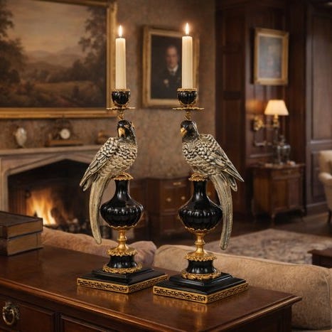 Et par bronzekandelabre i Napoleon III-stil, fra Frankrig, dateret 1850–1900, i forgyldt bronze med løvehoved-motiver, hver 59 cm høj, 32 cm bred og 32 cm dyb, vægt 5,2 kg pr. stk., i fremragende stand, med gyldent top og som en del af et ur-sæt (pendul færdig forsalgt seperat). Klik på den blå "gå til varen" knap, for at købe eller byde på denne vare. Den samlede pris vil blive vist inden du afgiver dit bud.