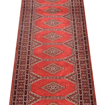 Smukt Bochara-tæppe med intens farve, håndvævet tæppe med længde fra 158 cm til 160 cm. På grund af håndværket varierer længden fra venstre til højre. Bredden er 74 cm. Dimensionerne er uden det beige bomuldssband og frynser. Klare farver blå, rød, brun, dyb orange og beige. Meget høj knudetæthed, se foto 6-8 knuder pr. cm. Folder sig blødt. På den ene side af frynserne er der sat en metalring med et label. Ved bomuldsbåndet kan man på nogle steder se gulning af bomulden. Pakistan.