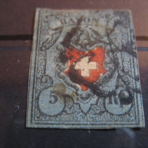 Schweiz 1920 - 5 Rp blå/rød med dele af krydsrammen Stein C2, L0 Typ 29 på br...