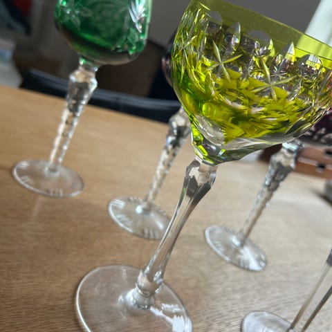 Pragtfuldt gammelt sæt i facetteret krystal i boheme-stil, bestående af en stor frugtskål og 5 matchende glas.