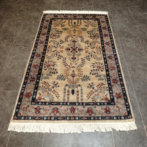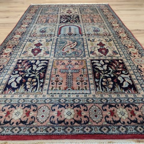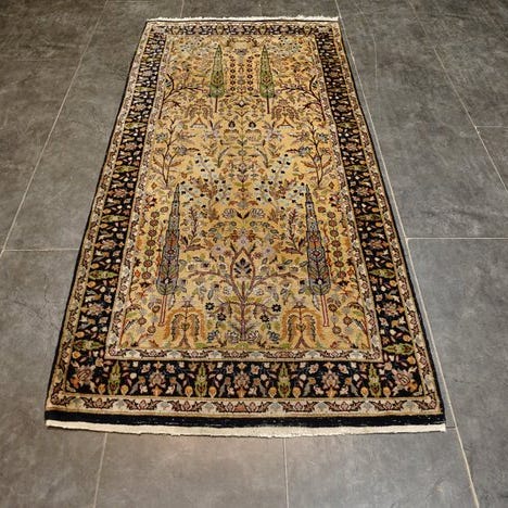 Et håndknyttet orientalsk tæppe fra provinsen Ghom (Her: Kaschmir Lahore).