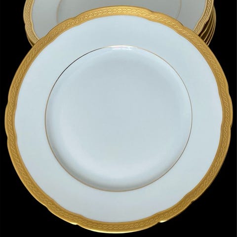 Bernardaud middagstallerkenerne har en buet kant og en klassisk guldornamental kant på cremefarvet porcelæn, mens desserttallerkenerne er fremstillet af rent hvidt Limoges-porcelæn, hvilket giver sættet et tidløst og alsidigt udseende.