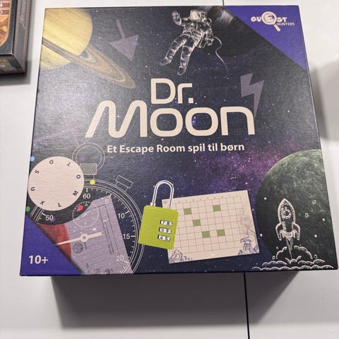 Quest Dr. Moon brætspil, escape room spil til børn fra ca. 10 år. Spillet foregår i rummet og går ud på at løse forskellige opgaver og gåder for at gennemføre missionen. Indeholder blandt andet spilleplader, kort og tilbehør til opgaveløsning. Egnet til flere spillere og kan bruges som familie- eller gruppespil.