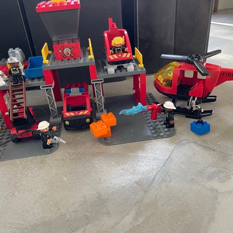 Duplo Brandstation med Stigevogn, Motorcykel, Lille Båd samt forskellige figurer og klodser