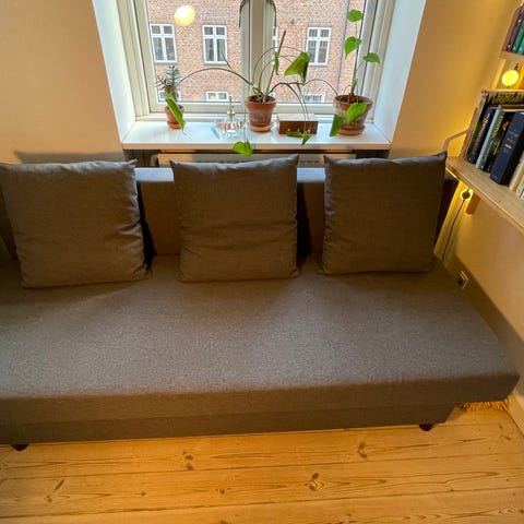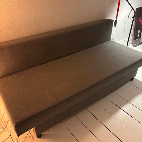 Sofaen har trods nogle små plamager kun været brugt ganske få gange. Den er nem at slå ud og fungerer godt både som komfortabel sofa i hverdagen og som praktisk gæsteseng. Smart opbevaringsplads under sædet til sengetøj eller tæpper.