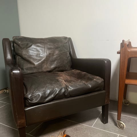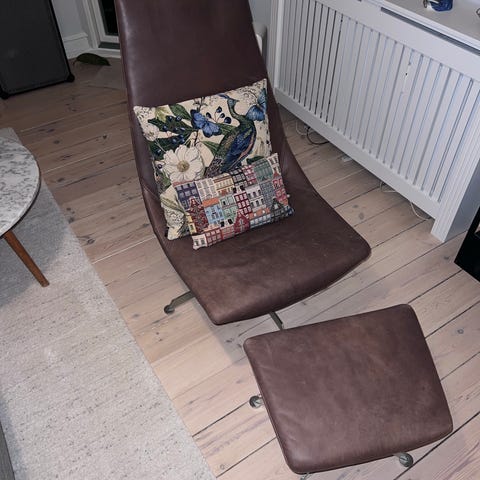 Lænestol i læder med skammel. IKEA fra 1980’erne. Læderet er noget lysnet - men stole og skammel fejler intet.