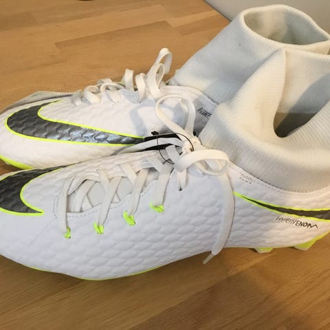Nike fodboldsko i størrelse 46. Skoene er primært hvide med røde detaljer og mørkt Nike-logo. Modellen har snørelukning og flad, lys sål, velegnet til indendørs fodbold eller andre indendørs sportsaktiviteter.