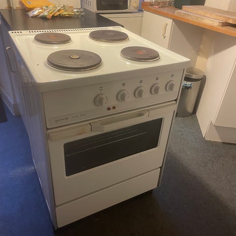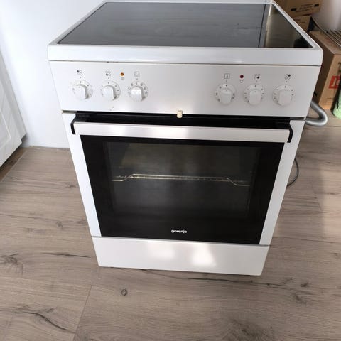Gorenje komfur i hvid. Fritstående komfur med ovn og kogeplade. Fronten har stor ovnlåge med glasrude og betjeningsknapper placeret øverst.