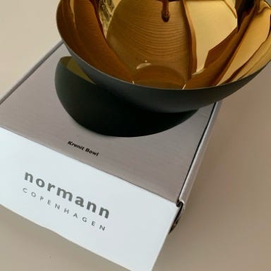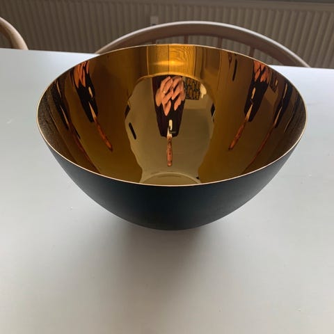 Sælger to utroligt smukke og klassiske Krenit-skåle i den luksuriøse guld/messing-udgave. Skålene er et ikonisk designelement, der kombinerer et minimalistisk ydre med en varm, skinnende inderside.