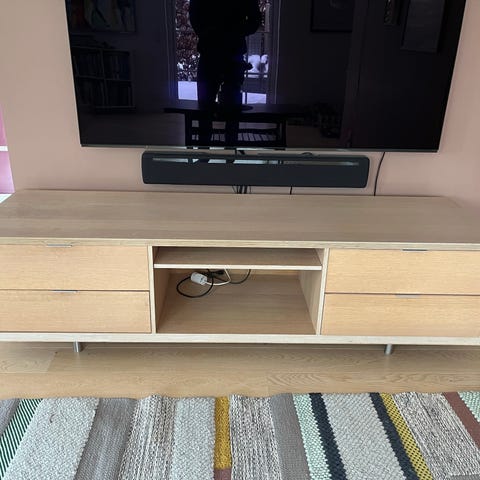 Første version af Bolia DiCaprio TV benk, i flot træ og mulighed til at bytte om lågerne for at få de sort stof låger foran som lad UR gå igennem og derfor en dvd player eller andet kan styres uden at åbne lågen.