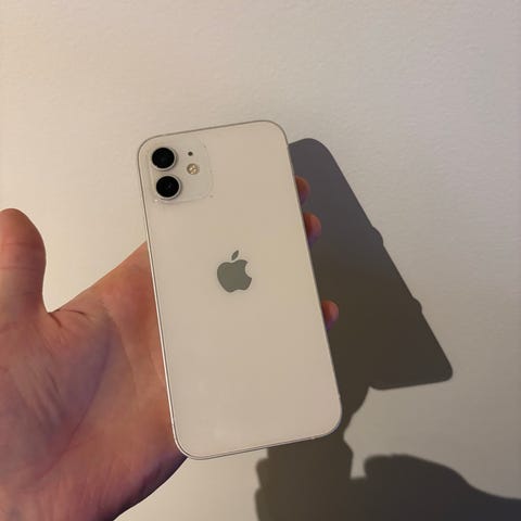 Apple iPhone 12 mobiltelefon med 128 GB intern hukommelse. Modellen er i farven hvid. Telefonen har dobbelt kamera på bagsiden og fuldskærmsdisplay på forsiden. Egnet til almindelig brug som opkald, beskeder, internet, apps og foto/video. Understøtter opladning via Lightning-stik og trådløs opladning afhængigt af tilbehør.