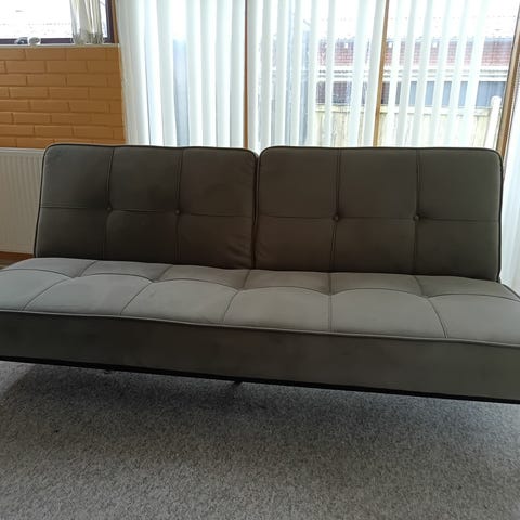 Sovesofa i træ med udtræk. Sofaen har stribet polstret ryglæn og sæde samt træramme med armlæn i begge sider. Underdelen kan trækkes ud, så sofaen kan bruges som seng. Underdelen er monteret på metalstel med hjul for nem udtrækning. Egnet som ekstra soveplads i stue, gæsteværelse eller sommerhus. Madrasmål udslået 200 X 160