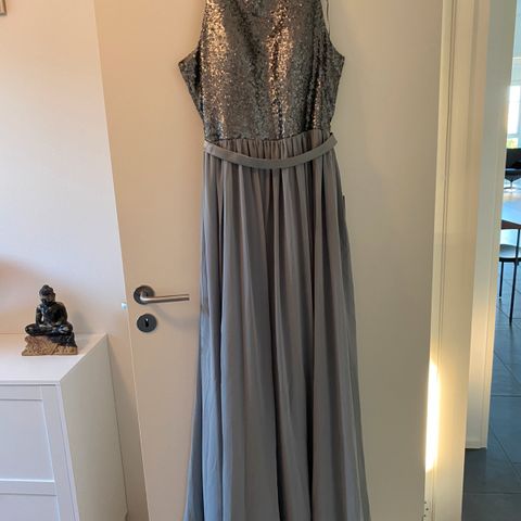 En helt ny lang grøn kjole i str 40. Kun brugt en gang til et bryllup, kjolen har få pletter, som kan komme af efter en rens.