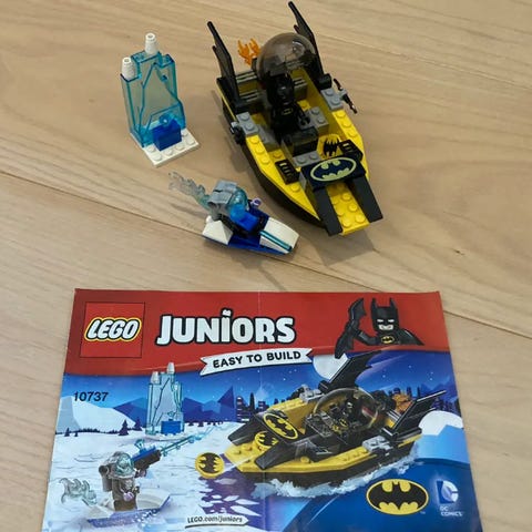 LEGO Batman byggesæt med fængslet Arkham Asylum, bat-helikopter og Harley Quins motorcykel. Figurer: Batman, Jokeren, Harley Quin og en fængselsvagt. Antal klodser: 171. https://www.lego.com/da-dk/product/batman-and-the-joker-escape-76138