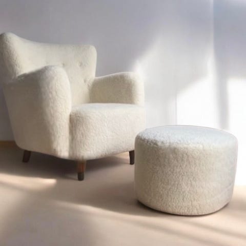 Overpolstret lænestol fra 1940’erne med skammel.
