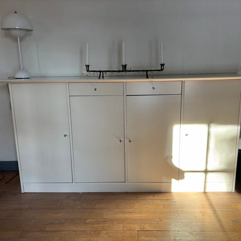 Hvid skænk, tung og solid kvalitet. Brugsspor, dog hovedsageligt inden i skabet. HxBxD : 82x120x50. Skal hentes, sendes ikke. Kr. 500