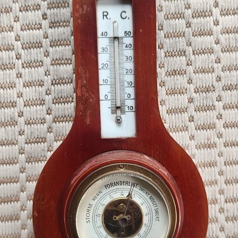 Glasset over barometeret er faldet af, har mindre skår i kanten. Monterings ringene medfølger, men måske mangler der noget til monteringen.
