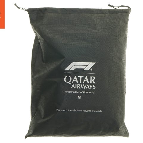 Dette er et sæt bestående af en grå pyjamas og sorte tøfler fra Qatar Airways. Pyjamassen har en knappet skjortekrave og kommer i størrelse L. Tøflerne har en blød inderside og en klassisk slip-on design. Produkterne leveres i en sort pose med Qatar Airways og F1 logoer trykt på forsiden, lavet af genbrugsmaterialer.