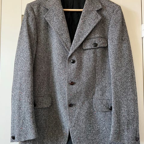 Vintage tysk / tyroler inspireret jakkesæt til herre i str. 52. Sættet er i grå uld og består af jakke og bukser. Jakken har knaplukning foran, bryst- og sidelommer samt dekorative detaljer ved revers og lommer. Bukserne har bæltestropper, baglomme med knap og klassisk pasform.