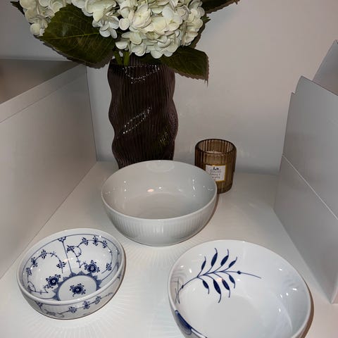 Royal Copenhagen skåle i porcelæn. Sættet består af tre skåle i hvidt porcelæn med blå dekoration samt én helt hvid skål. Skålene har rillet kant og klassisk Royal Copenhagen-stil.