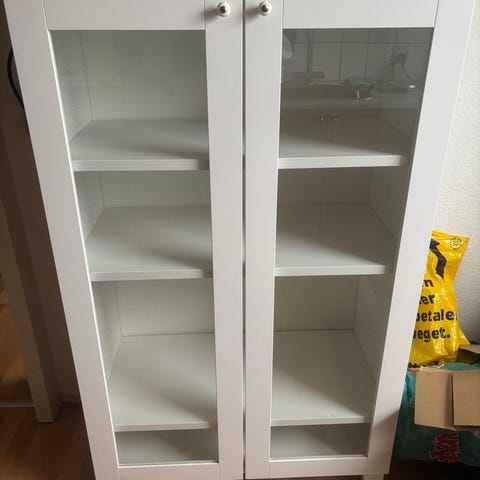Skabet har både lukkede hylder og glaslåge, så det er velegnet til service, glas, bøger eller opbevaring.