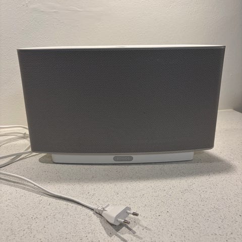Sonos Play:5 trådløs højttaler i sort. Modellen er egnet til brug i hjemmet som selvstændig højttaler eller som del af et Sonos-multiroom system. Højttaleren tilsluttes strøm og kan forbindes til netværk via ethernet-portene på bagsiden eller trådløst gennem et kompatibelt Sonos-setup. Enheden har betjeningsknapper på toppen til volumen og afspilning. Velegnet til streaming af musik fra Sonos-appen og understøttede musiktjenester.