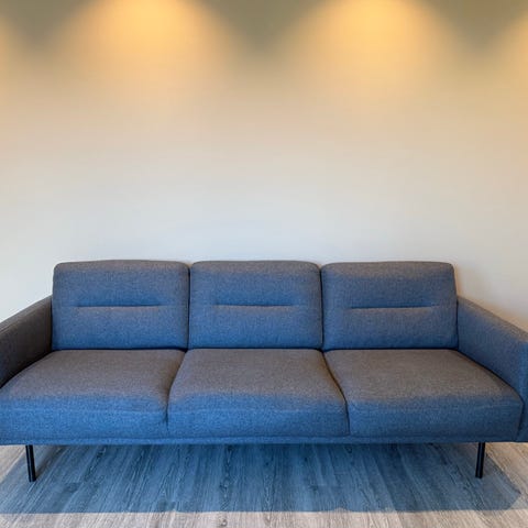 Den er brugt på extra værelse.. så ikke særlig meget brugt og den ser stort set ud som ny /dog med lille mærke på armlæn -se sidste 2 billede - jeg ved desværre ikke hvad der er sket.. vi har bare haft et tæppe hængende over armlænet eller en pude op af