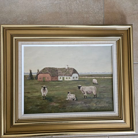 (198) Maleri af Kay Birkmose født 10/3-1933 Landskab m/ Køer i Guldramme