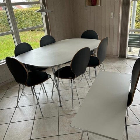 Fint lille spisebord i Piet Hein look. Der kan medfølge 4 stole. Små ridser, men rigtig pænt. Kan nemt omlakeres for små penge. Ben kan nemt afmonteres. Kan evt købes hver for sig.