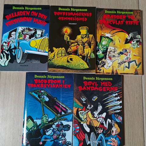 Dennis Jürgensen bogsamling fra monsterserien. Pakken indeholder fire bøger med farverige, tegneserieprægede forsider og bagsider. Bøgerne er paperback-udgaver på dansk og tilhører samme serie/univers med humoristiske monster- og horrorfortællinger. Velegnet til læsere, der er interesserede i danske fantasy- og gyserbøger for børn og unge.