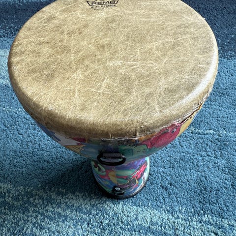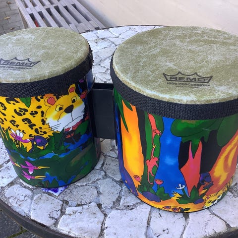 Remo tromme børnemodel med farverigt, tegneserieinspireret motiv på trommens sider. Trommen har rund trommeskindsoverflade og cylindrisk trommekrop i plast med små fødder i bunden for stabil placering. Velegnet som rytmeinstrument til børn eller begyndere i musikundervisning og leg.