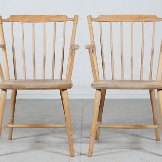 3 stk. velholdte Windsor-stole / armstole i massivt egetræ. De er kendetegnet ved deres buede ryg med lodrette pinde og en central, dekorativ rygplade, der har et udskåret motiv.
