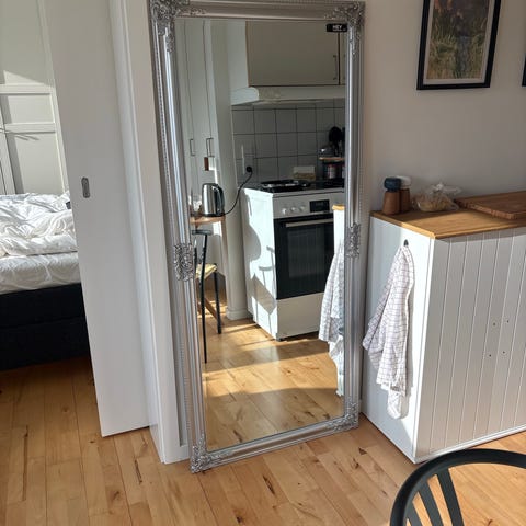 IKEA spejl med sølvfarvet ramme. Rektangulært vægspejl med profileret ramme i sølvlook, egnet til brug i entré, soveværelse eller stue.