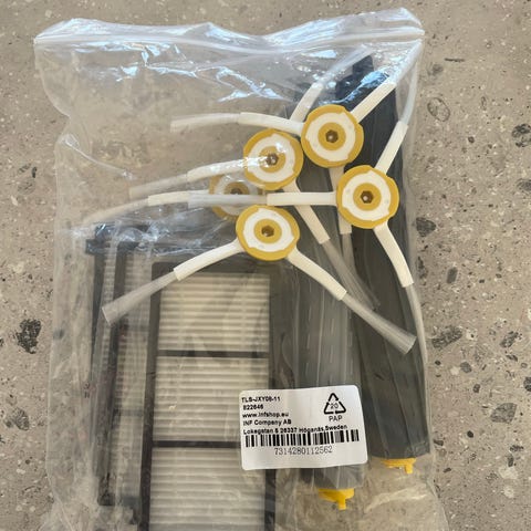 iRobot tilbehørssæt til robotstøvsuger. Sættet indeholder støvsugerposer med plastkobling, to grønne gummivalser/børster, et HEPA filter samt små sidebørster. Delene er beregnet som udskiftelige sliddele til en iRobot i8 robotstøvsuger og kan anvendes til løbende vedligeholdelse og udskiftning af slidte komponenter.