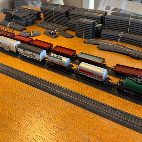Sættet består af 6 lige skinner, 12 buede skinner, transformer , lokomotiv ,2 passagervogn , tipvogn og 2 ladvogne, meget fint stand som nyt, sælges samlet,se billeder