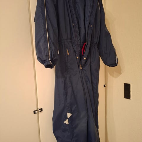 Heldragt med hætte i en mørk blå farve. Dragten har en lynlås foran og to lynlåslommer. Der er elastik ved ærmeenderne og benene, hvilket sikrer en god pasform. Dragten har reflekser på ærmerne og nederst på benene for øget synlighed. Den er også udstyret med fodstropper for bedre støtte.