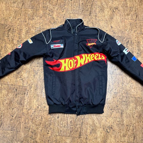 Et par børnesko i størrelse 26 med Hot Wheels tema. Skoene har en kombination af blå og røde farver med gule accenter. De har velcro lukning og dekorationer, der repræsenterer bilmotiver og flammer. Ydersålen viser tegn på almindelig brug.