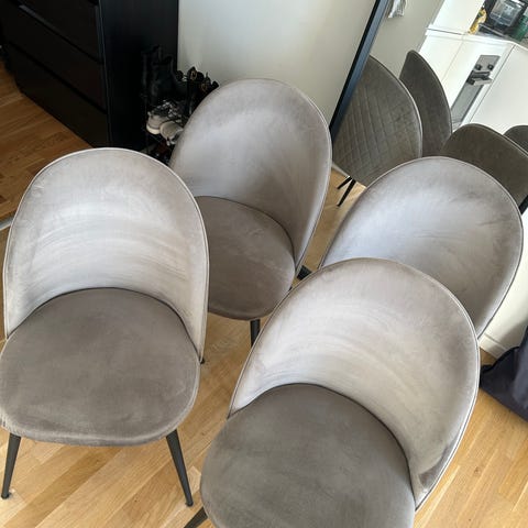Der sælges 4 styks grå velour stole med metalben (træfarve, se billede) prisen er for alle 4 stole.