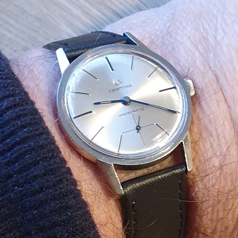 Certina Waterking årg. 1969. Klassisk vintage Certina i stålkasse, der alligevel adskiller sig fra mængden, idet uret har subsecond, altså lille sekundviser, der sidder for sig selv. Samtidig har uret de relativt sjældne og attraktive blue hands, altså blå visere. Uret har med den ellers meget enkle skive derfor et skarpt og køligt udseende, der understøttes af den næsten ubrugte sorte Hirsch læderrem. Urets serienummer er 7001 075 5619929. Uret har brugsspor, men er virkelig pænt de 55 år taget i betragtning. Servicehistorik ukendt, men uret går fint.