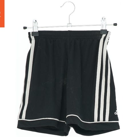 Disse sorte shorts har en elastisk talje og hvid kontrastlinje ved linningen. De er dekoreret med fine, hvide striber og har Adidas-logoet på nederste del af det ene ben. Der er to sidelommer.
