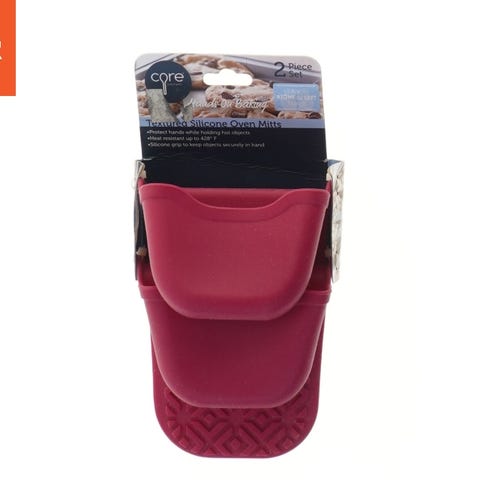 Disse grydelapper er fremstillet af silikone og har en lys rød farve. De afbildede grydelapper har et tredobbelte grip-design, som hjælper med at holde et fast greb når man håndterer varme genstande. De har en længde på 38 cm, hvilket giver en god beskyttelse af hånden. Mærket 'SK' er trykt på den sorte del af manchetten, som også har en loop funktion til ophængning.