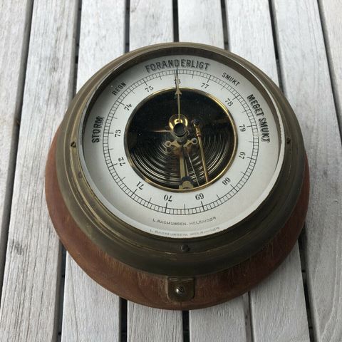 Vintage Barometer designet som et skibsror. Diameteren er 14,5 cm. Barometeret er hovedsageligt lavet af messing (?). Det viser forskellige vejrfænomener som 'Regn' og 'Foranderligt'. Velegnet til at give en nautisk eller vintage følelse til indretning.
