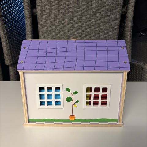 Dette er et legehus til børn med dimensionerne 20,5x21 cm. Det har et blåt tag, en gul klokke og vinduer. Indenfor er der dekorationer som bannere, jakker hængt op og forskellige skoleartikler. Perfekt til fantasifuld leg.