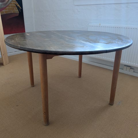 Fint spisebord i lyst eg med firpssfod. Bordet er med udtræk men uden plader. Bord er har været repeteret men fungerer fint. 110 i diameter
