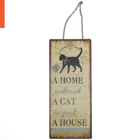 Dette er en vægdekoration med teksten 'A home without a cat is just a house'. Dekorationen har et kattemotiv og er designet i en vintage stil. Det er en rektangulær metalplade med målene 30,5x13 cm. Den hænger fra en metal kæde, der gør det nemt at montere på væggen. Bagsiden viser ingen ekstra design og bærer et mærkat med en stregkode.