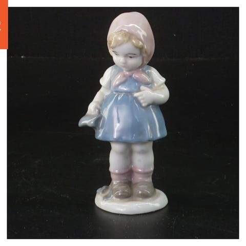 Dette er en lille figur formet som en kvinde i en lang, flerlags kjole. Den er lavet af metal og har en sølvfarvet finish. Figuren har en dekorativ stil med detaljer i kjolen, der giver den et klassisk udseende.