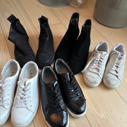 Skopakke med 8 par sko, sælges samlet. Mærker som: Nike, Stine Goya, Ecco, Angulus og Asics.